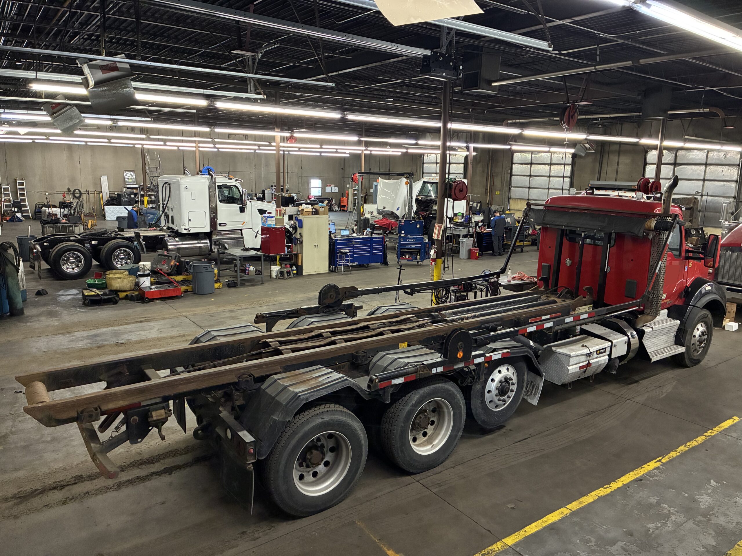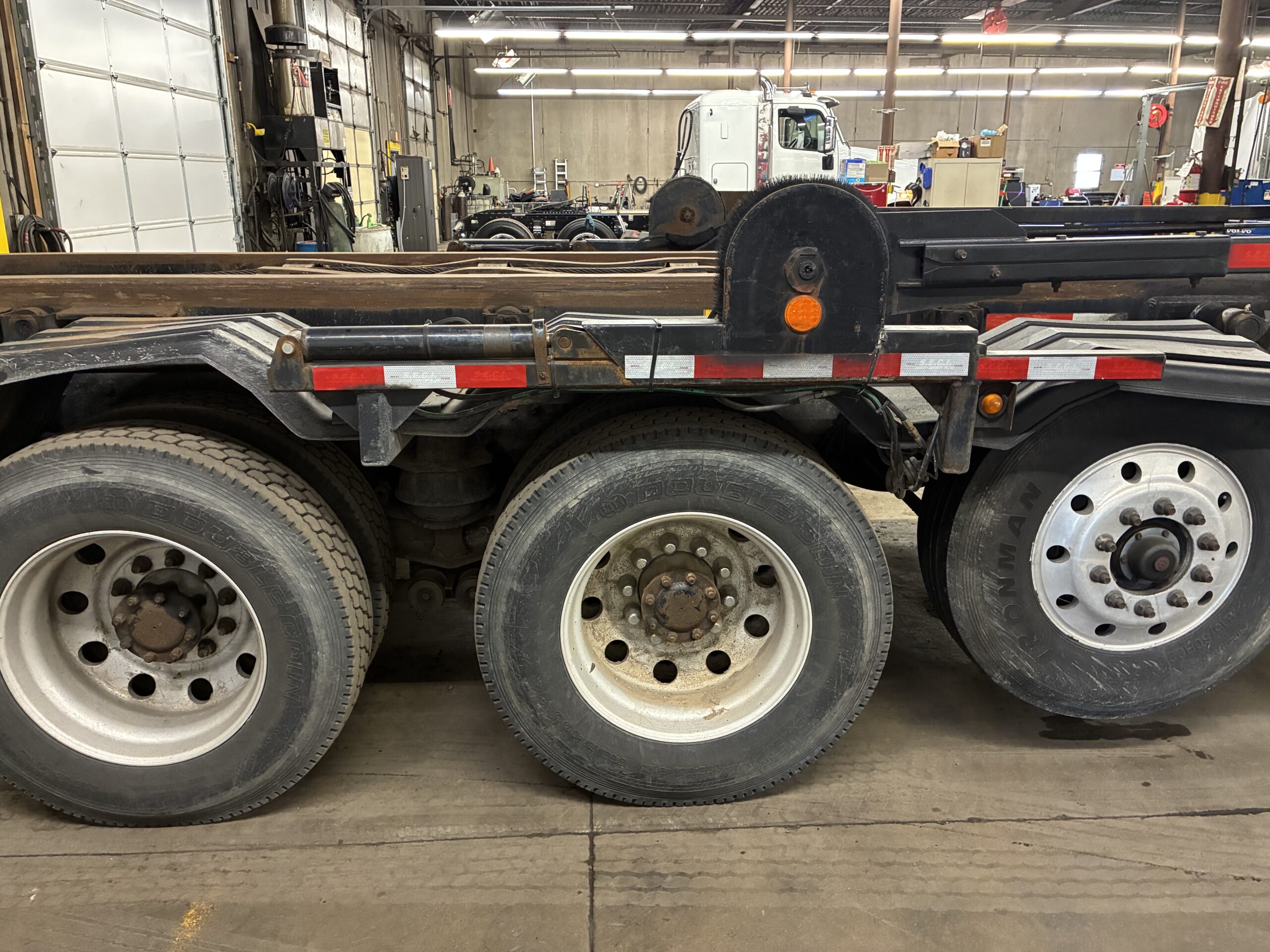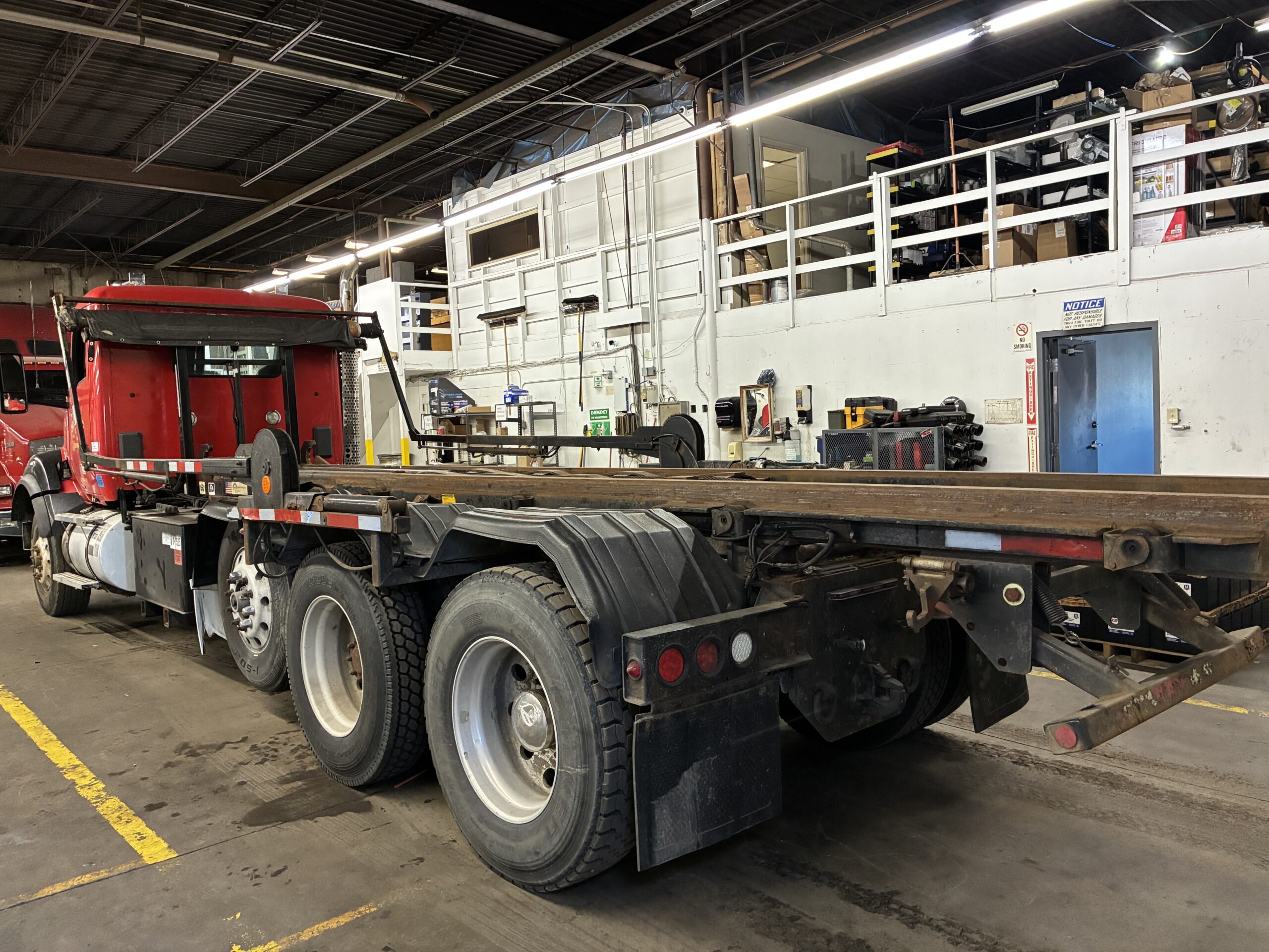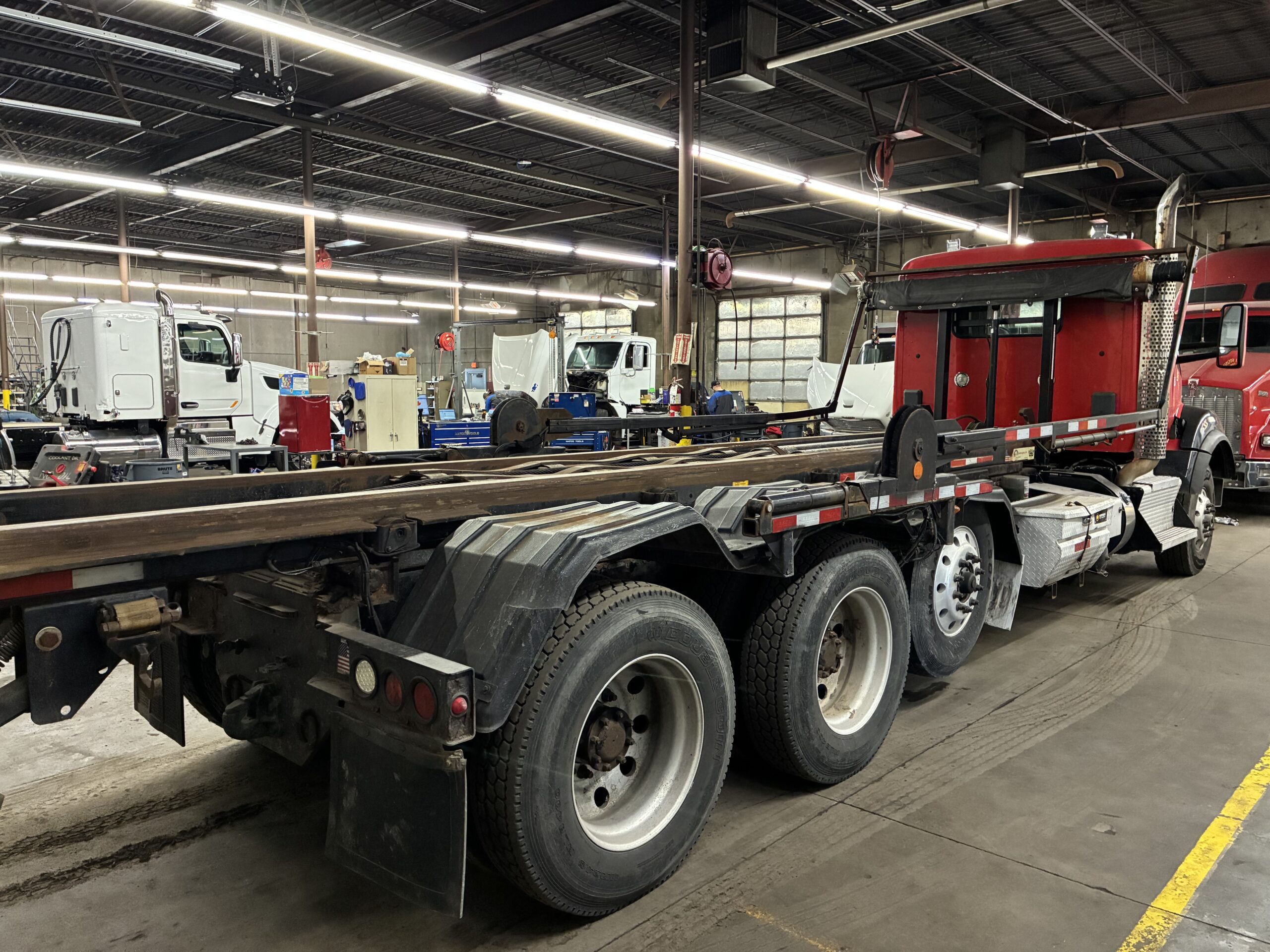 The 8×4 axle configuration includes a lift axle and tri-axle setup. In addition, the walking beam suspension supports heavy loads on uneven terrain. The truck carries an 80,000 lb GVWR rating with 20,000 lb front axle capacity and 66,000 lb rear axle capacity. Therefore, it handles large containers and jobsite operations with confidence.