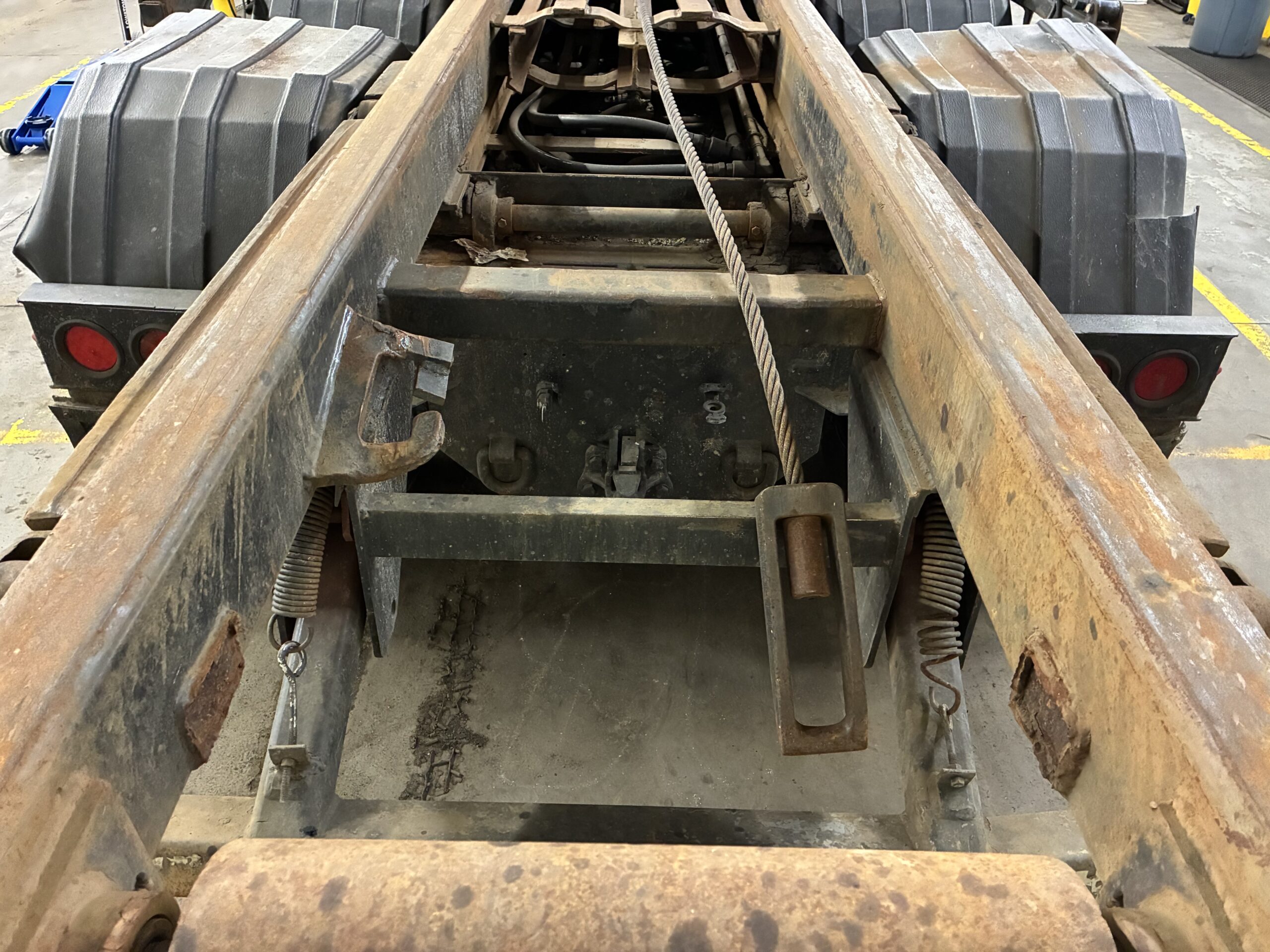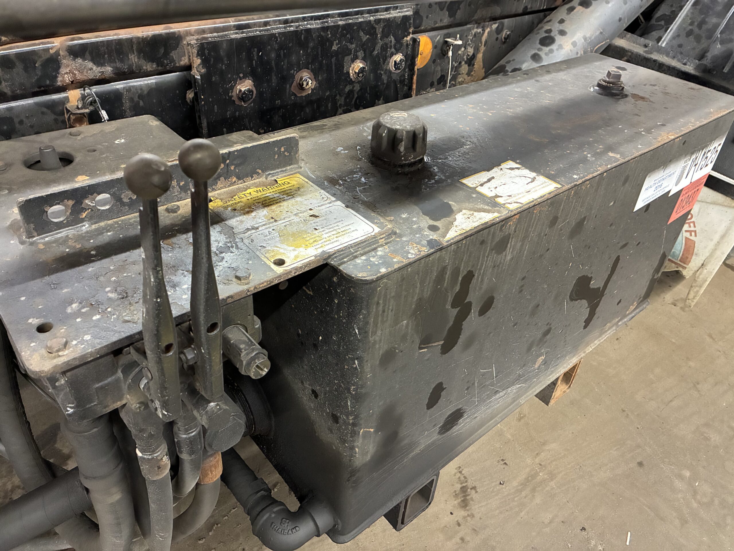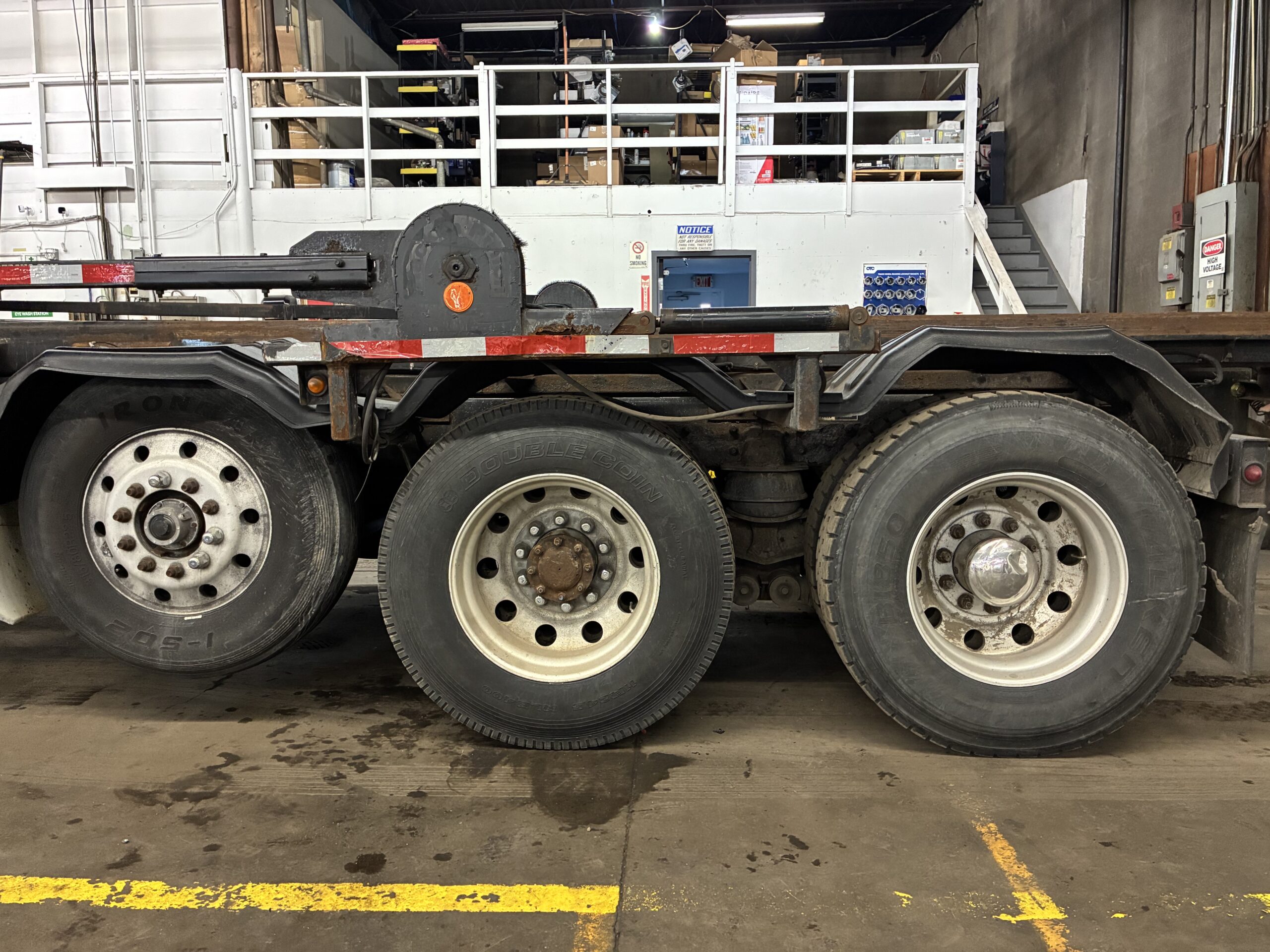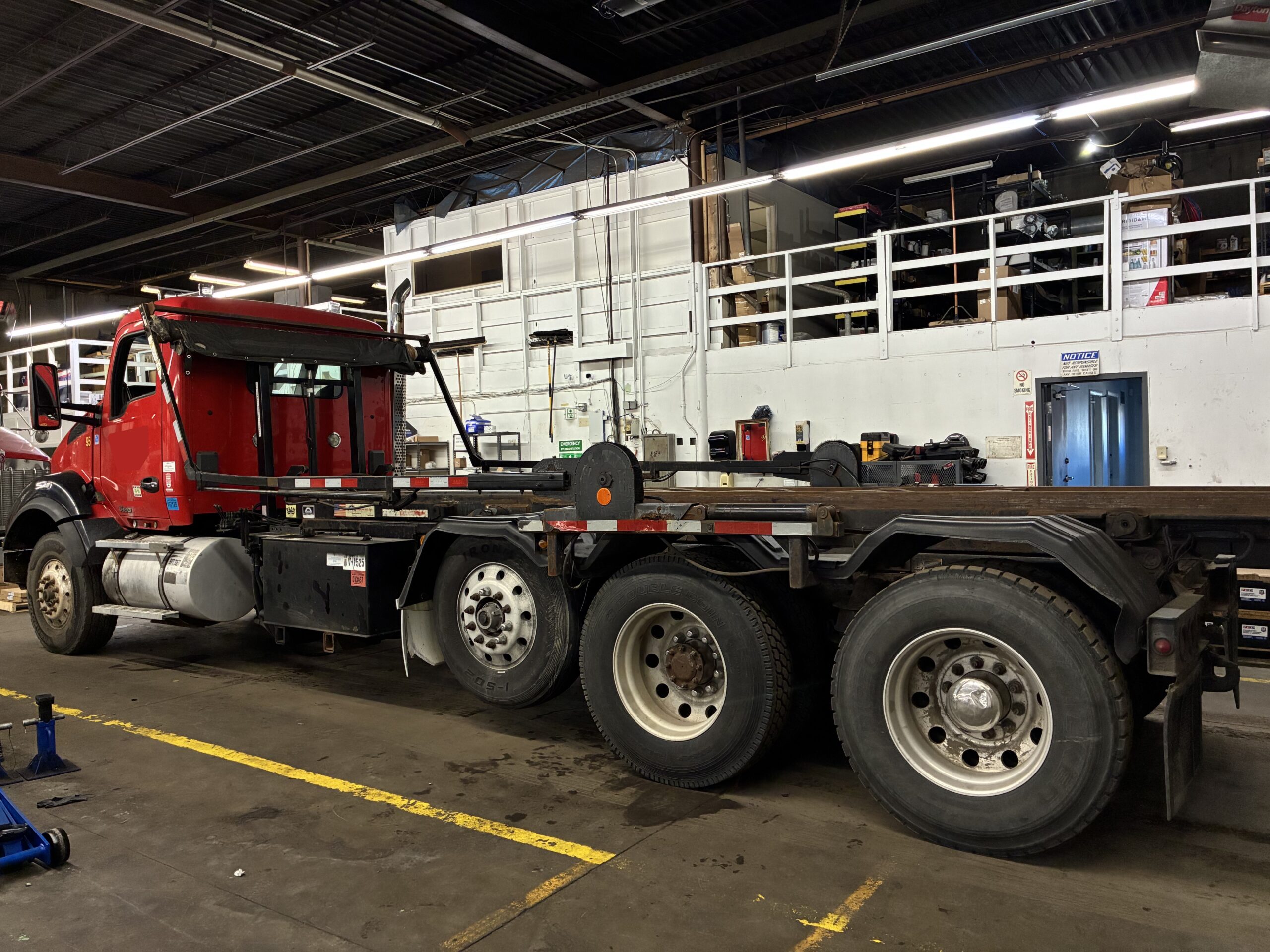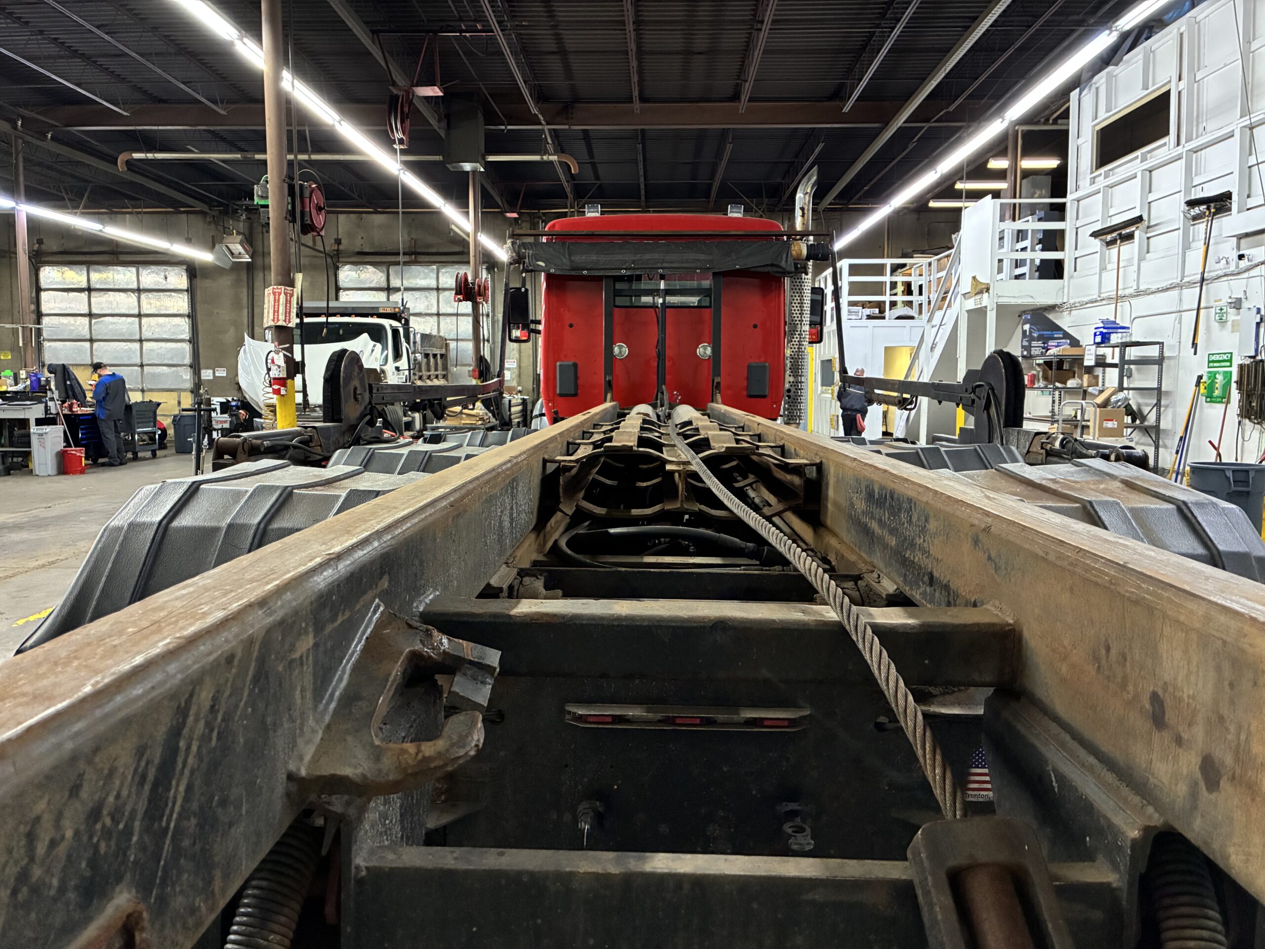 The 8×4 axle configuration includes a lift axle and tri-axle setup. In addition, the walking beam suspension supports heavy loads on uneven terrain. The truck carries an 80,000 lb GVWR rating with 20,000 lb front axle capacity and 66,000 lb rear axle capacity. Therefore, it handles large containers and jobsite operations with confidence.